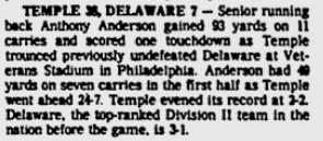 My favorite Temple football game of all time was Temple 45, Delaware 0. A close second was Temple 31, Delaware 8—both at Delaware before capacity houses of over 20,000 fans. (I also enjoyed Temple 56, Uconn 7, at Franklin Field and the 56-28 and 49-7 wins over Rutgers.) At Veterans Stadium, when Delaware was the top-ranked team in Division II (now FCS) football, Temple beat Delaware 36-7 (see inset). I enjoyed that game very much. topranked