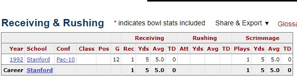 Wingard’s career football stats were modest–a catch for five yards in that 1992 season–but he’s listed as playing on all 12 games that season. My best guess is that he was an offensive lineman because, despite being a track star at West Chester Henderson, he also has no interception or tackle stats at Stanford. He was listed as a 1992 pre-season All-American and pre-season All-Americans usually have stats on college football reference’s site (unless they are offensive linemen).