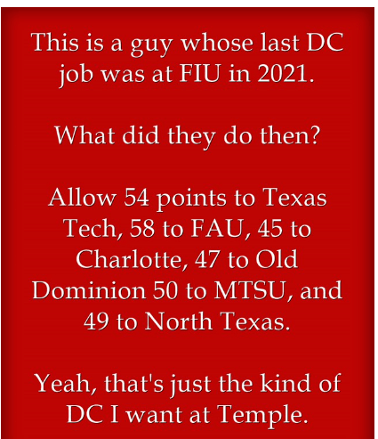 Yet Drayton likes the guy and he’s going to be Temple’s DC. I love Drayton the man but I hate this decision. Go out and hire the best guy not a guy you like and are comfortable working with.