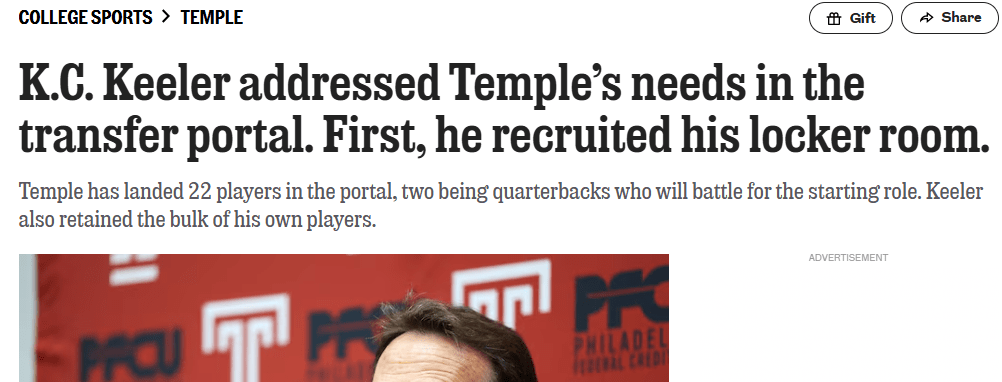 Temple head coach K.C. Keeler is of that certain age and now he is in charge of a figurative high-wire act that is almost as impressive, navigating a transfer portal without the net of SEC or Big 10 type money.