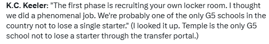 Temple was the ONLY G5 team that kept all of its starters out of the transfer portal–with a qualifier. The starters applied to only the last game of the season and not guys who started single games before that.