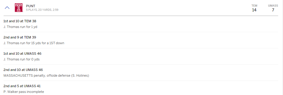 If any team was set up to be punched in the face, it was Massachusetts but, the Owls, like so many other times in the last three years, outsmarted  themselves by throwing the ball on their first 2d and five situation of the game and then again on their first 2d and three opportunity, which came early in the second half. Even if that play fails, you are more likely than not facing a third and 1 or a third and 2 on the next one. Then you go Temple Tuff again and punch them in the mouth.