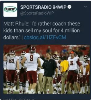 Contrast that to this: Matt Rhule, in the same week he was preparing Temple for the AAC championship game, said there was no amount of money that could take him away from his Temple players.