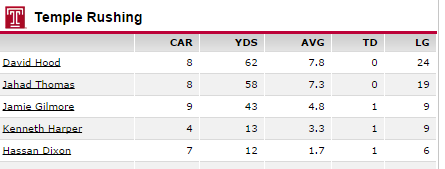 The Owls went from guys Anthony Anderson and Zack Dixon and Kevin Duckett to guys like Paul Palmer and Todd McNair to guys like Elmarko Jackson and Stacy Mack to Jason McKie and Tanardo Sharps to the more recent vintage of Bernard Pierce, Matty Brown and Montel Harris.