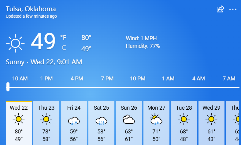 Tomorrow’s high at Tulsa is 59 but there is plenty of wet weather in the forecast.