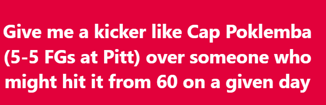 The Owls played dumb football then. Army played smart football today. The hard reality is for all of the great compliments Keeler had about kicker Carl Hardin is that he missed makeable field goals (45 and 38 yards) against both service academies. Just one would have put the Owls in a bowl game. Keeler said Hardin can hit it from 60, but I’d rather have a consistent kicker from 45 and in than the threat of hitting one from 60. Give me a guy like Cap Poklemba–who went 5-for-5 in field goals at Pitt–over someone who might hit it from 60.