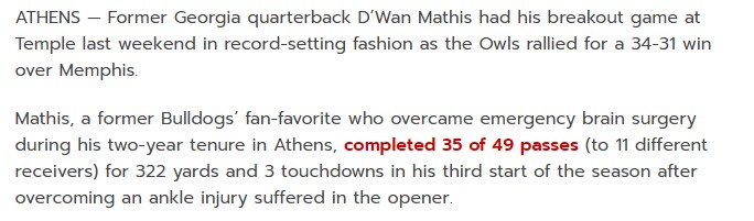 He showed flash as in one, the Memphis game. If Mathis showed flashes, maybe the Owls steal a win or two in the other AAC games. It was a damn good flash (35-for-49, three touchdowns) but it was a one-and-done nonetheless.