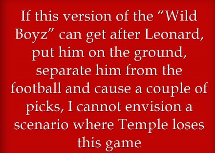 If this version of the “Wild Boyz” can get after Leonard, put him on the ground, separate him from the football and cause a couple of picks, I cannot envision a scenario where Temple loses this game.