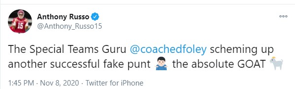 “Why don’t these guys like me, Anthony?” “Coach, get Foley back, start blocking punts and returning kicks for touchdowns, give me a fullback and ditch the RPO and you’d be surprised how much the guys would love you.”
