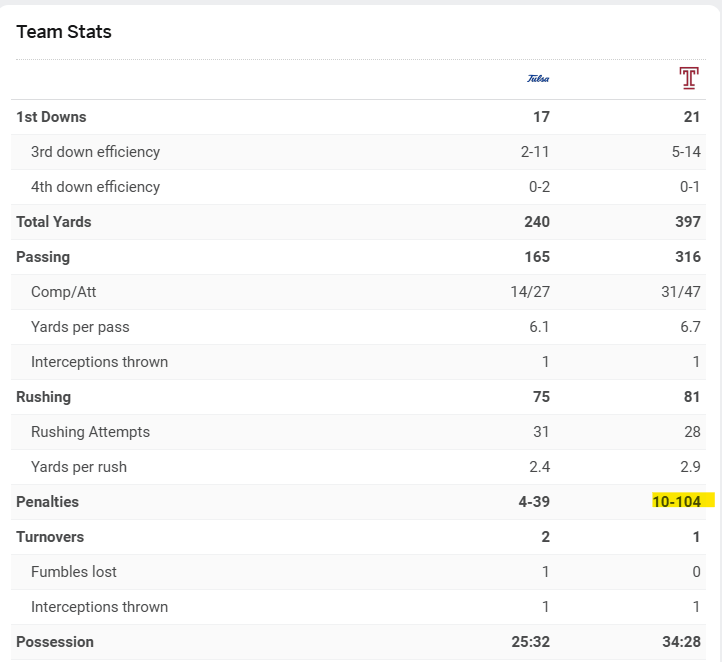 Eliminating the penalties is the way to beat these teams like East Carolina and FAU coming up. Continuing with this season-long trend is a formula for joining Tulsa at the bottom of the league standings.