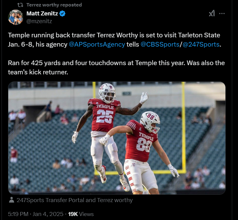 On the field, Tarleton State doesn’t have a TV contract and plays pretty obscure opponents in Drake, West Georgia, Eastern Kentucky, Utah Tech (not regular Utah or Temple opponent Utah State) and Austin Peay. (Worthy also has a scheduled visit to UTEP but that is also a worse program than Temple by any measurement.)