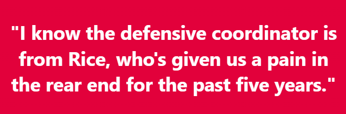 “I know the defensive coordinator is from Rice, who’s given us a pain in the rear end for the past five years.”